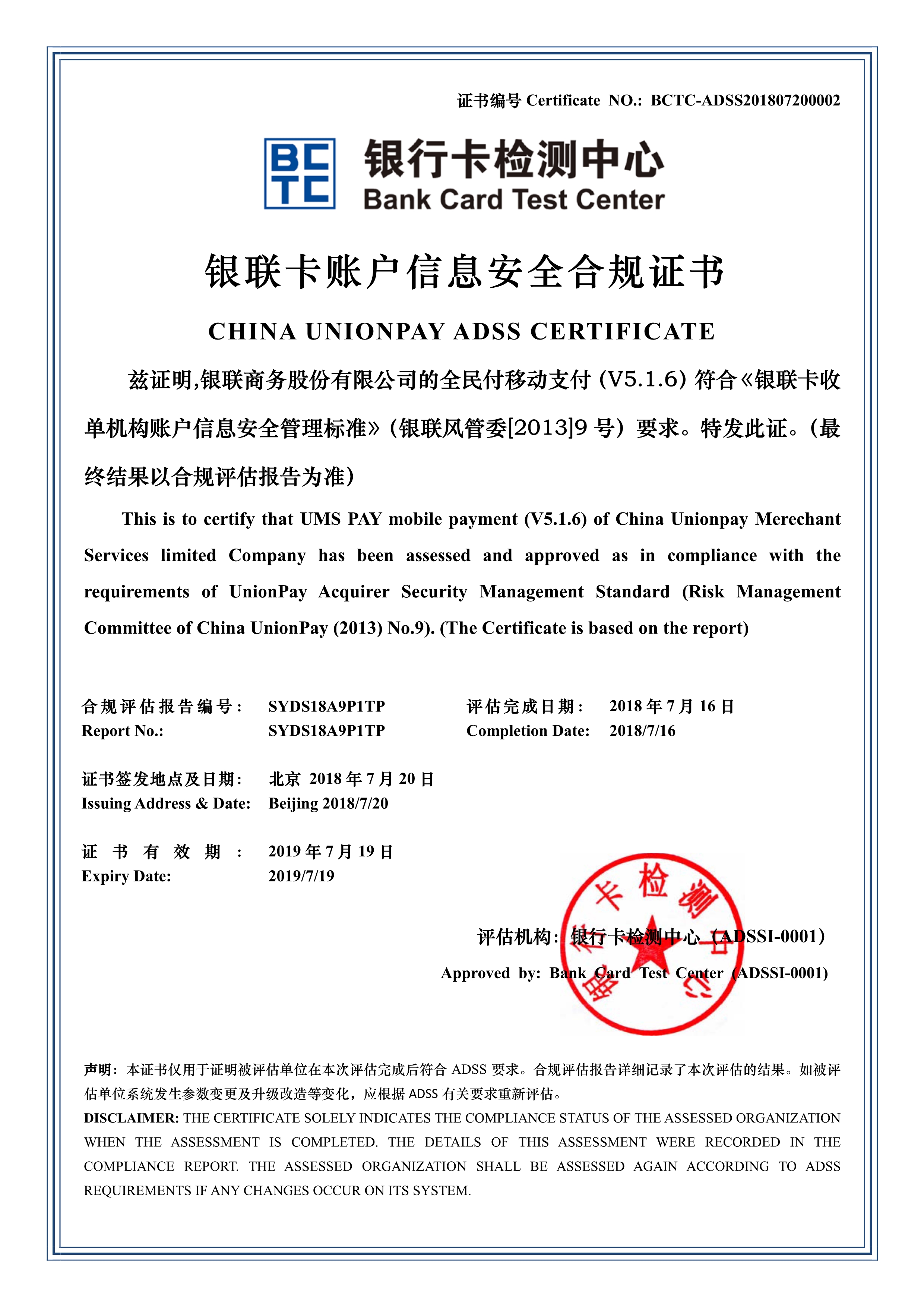 银联卡账户信息安全合规证书